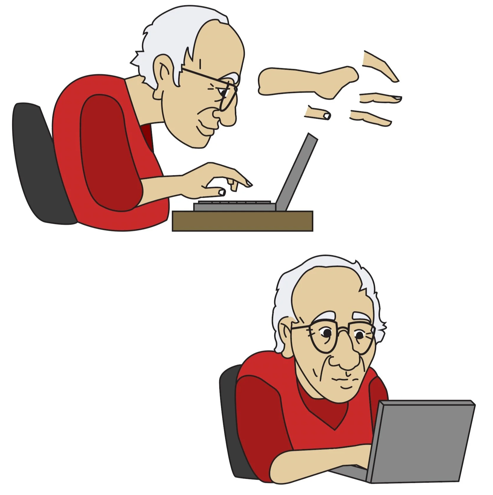 A freelance project where an existing client asked me to create illustrations of him based on a photo. The illustrations were to be used for a pitch deck and had to be compatible for animating in Adobe After Effects. David Katz is a TV and film writer and runs a company called Cascade Pass Inc. He desired his caricature to resemble Woody Allen, with exaggerated features like a large nose and glasses. He wanted an illustration of him typing on a computer from two angles and another of him standing dreamily outwards.