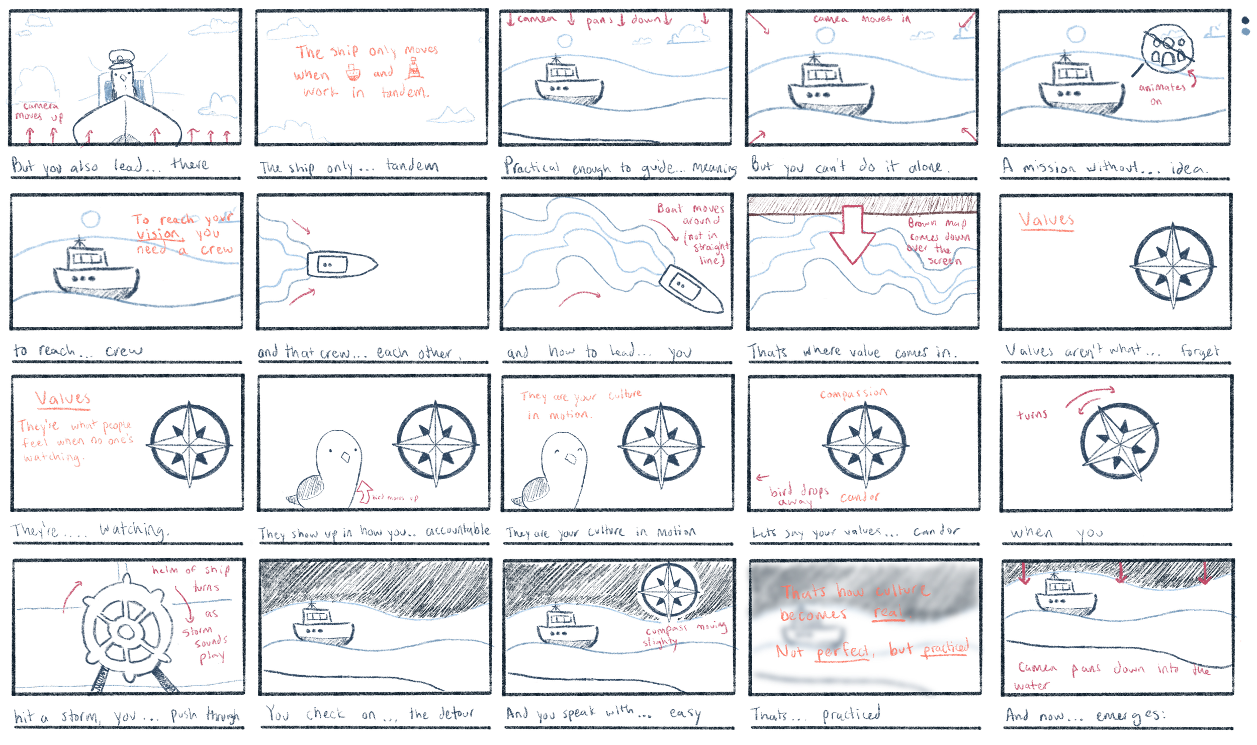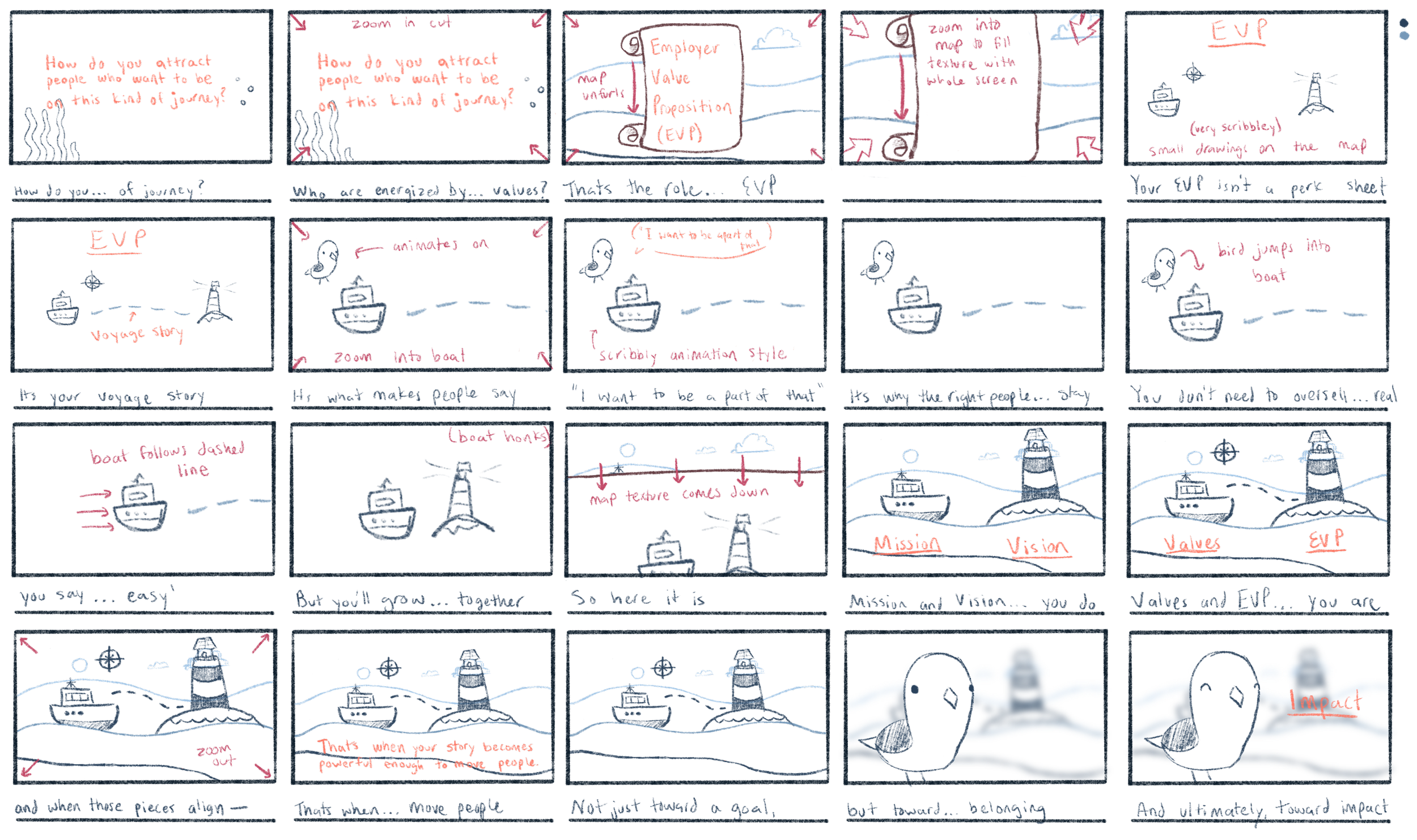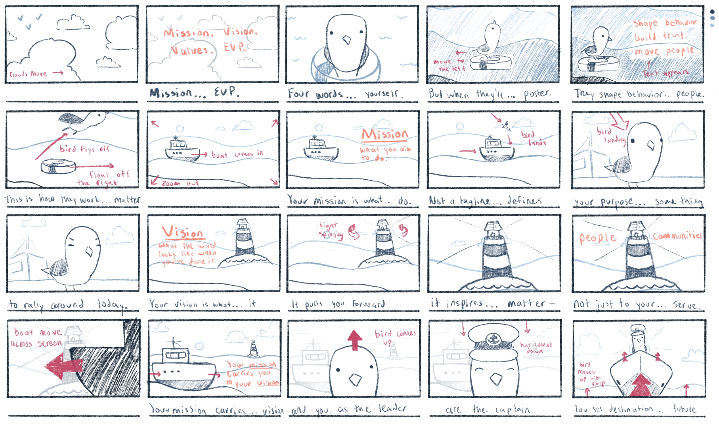 Our friends at StoriTel came to us with a question: how do you explain mission, vision, values, and EVP in a way that feels meaningful and memorable? Instead of sharing them as separate definitions, we turned them into a story. Mission became the vessel, vision the island on the horizon, values became the compass that keeps everyone on course, and EVP the tale of the journey itself. To guide viewers through this world, I introduced Fred, an optimistic and curious little bird who swoops in to make each idea feel welcoming and human. The final animation allows leaders to share a detailed understanding of concepts and terms that often remain abstract.